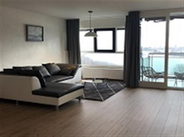 Mooie, ruime woonkamer met prachtig uitzicht op de Nieuwe Maas, toegang tot een zonnig balkon op het zuiden.